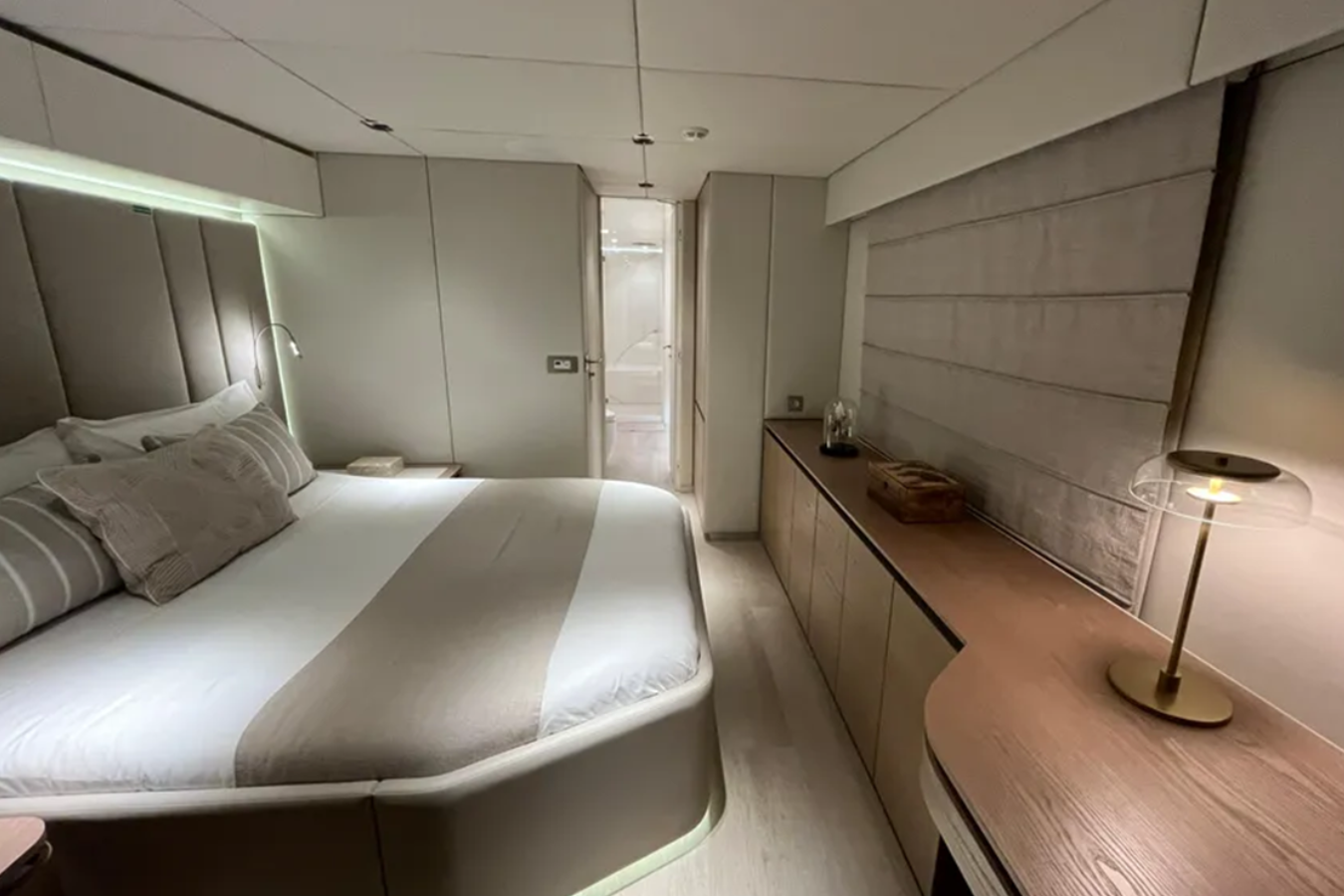 The 70 Sunreef Power’s main deck saloon offers a seamless connection to the aft cockpit, creating an expansive space for dining and relaxation. Featuring a skylight, panoramic glazing, and wide sliding doors, the interior is awash with natural light. The yacht’s fully customizable design ensures every detail reflects the owner’s taste and lifestyle, making it the ultimate expression of personal luxury.