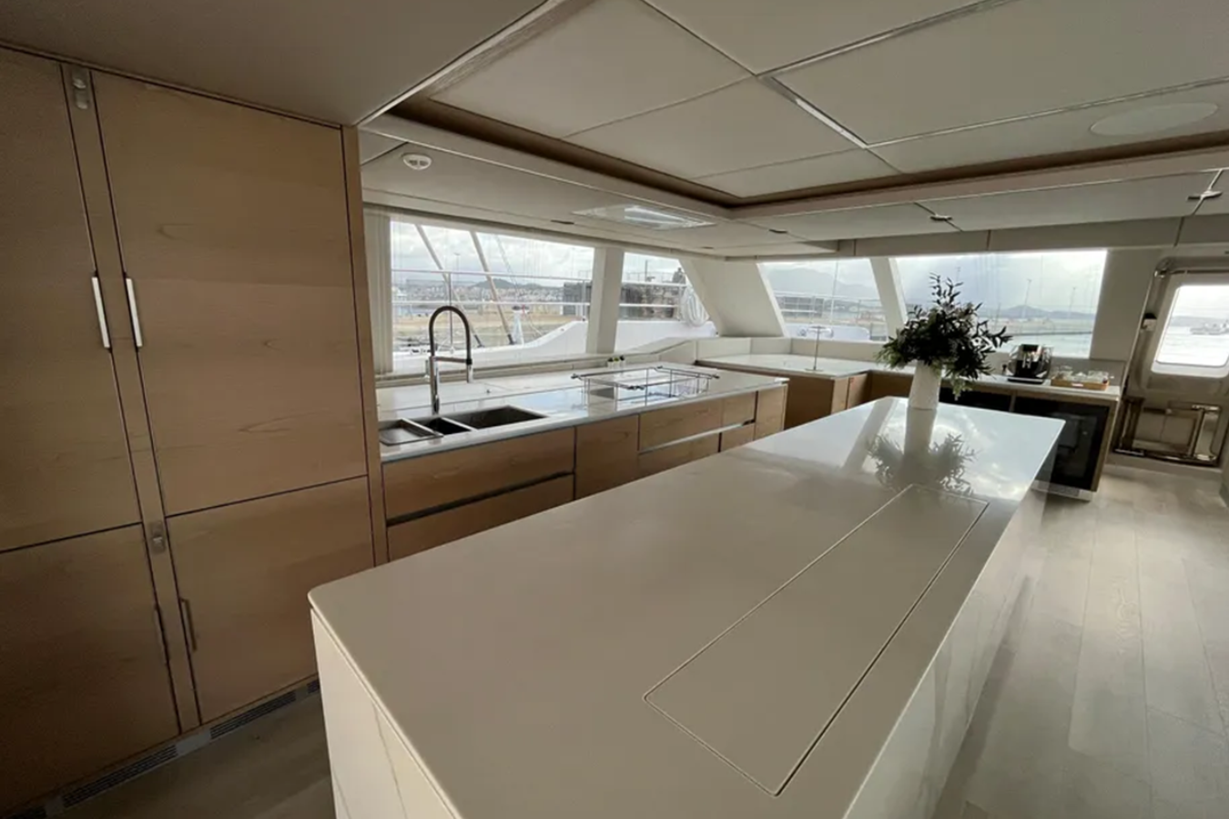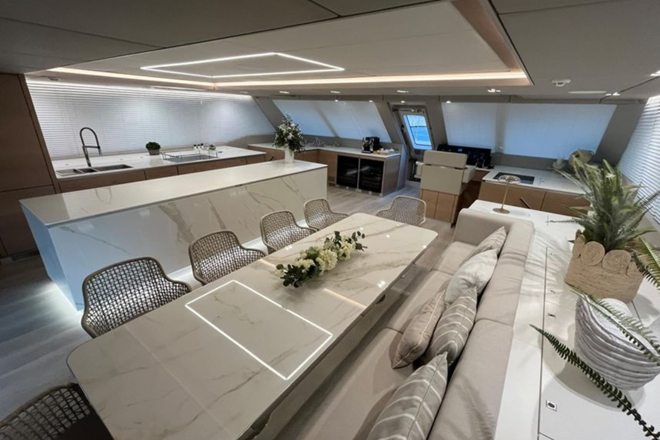 The aft cockpit of the 70 Sunreef Power serves as a versatile space, perfect for alfresco dining, lounging, or launching water sports activities. With its innovative hydraulic platform and aft garage, the yacht ensures effortless access to water toys, personal watercraft, and tenders, adding an adventurous edge to every voyage.