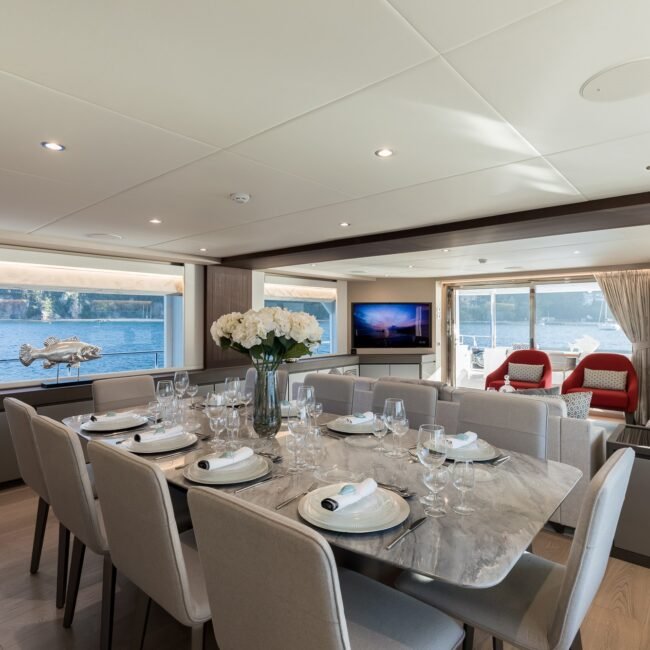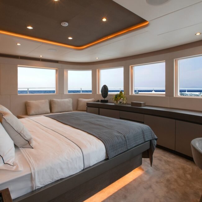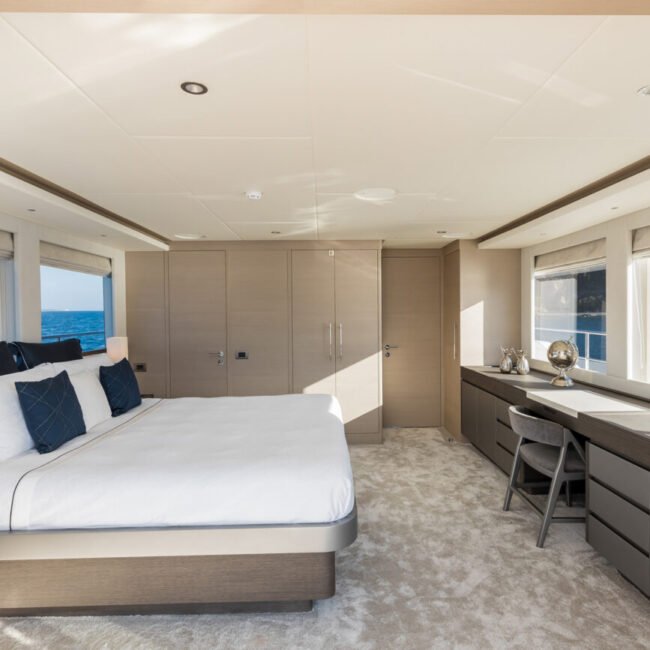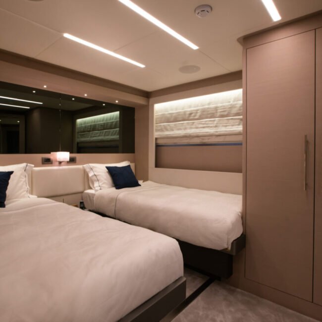 This yacht offers luxurious accommodation for up to 10 guests across five spacious staterooms, all featuring ensuite bathrooms. The crew quarters are thoughtfully designed to host three crew members in total comfort, ensuring professional service without compromising privacy. A convenient day head on the main deck enhances the onboard experience, especially during long journeys or when entertaining guests.