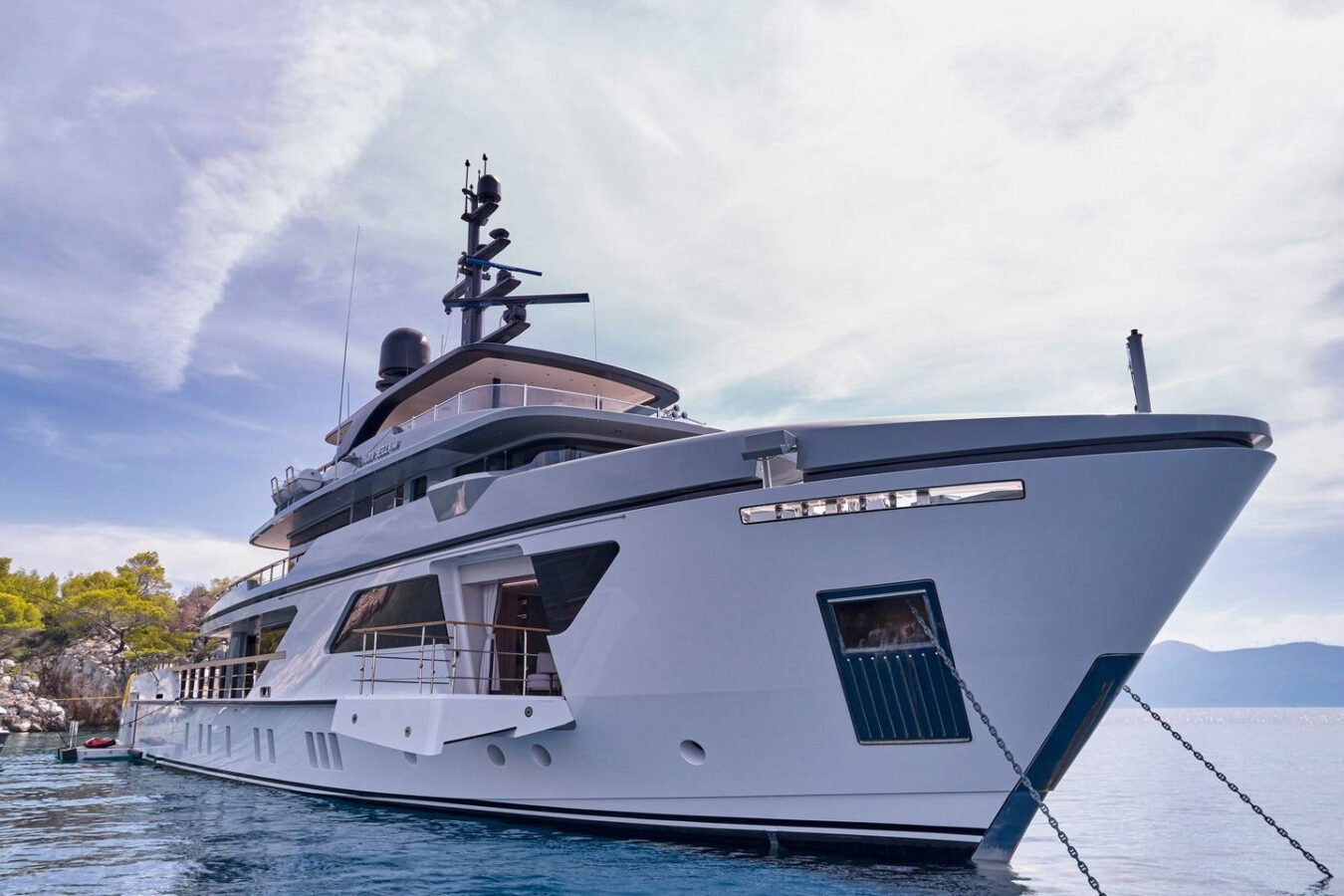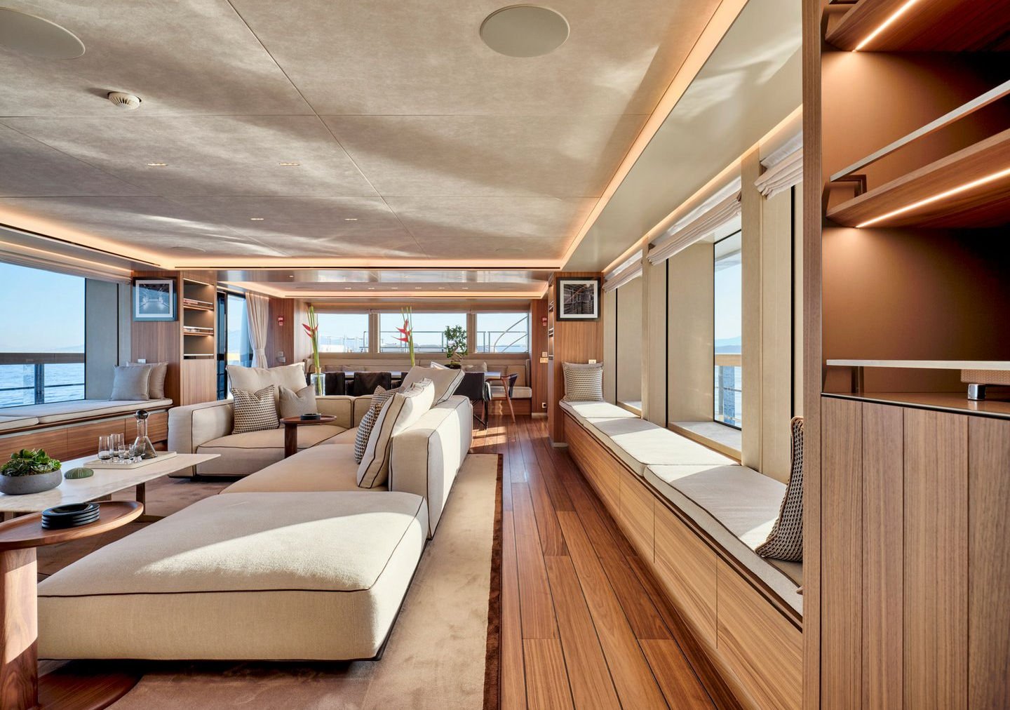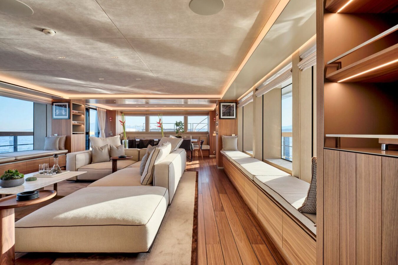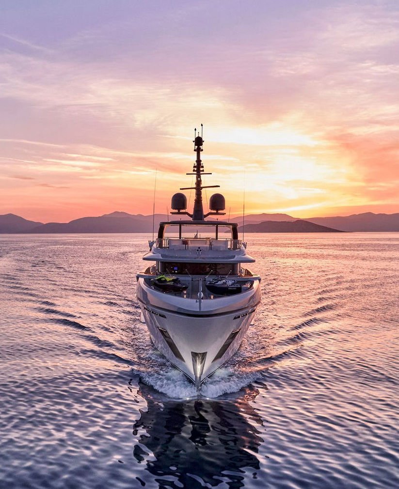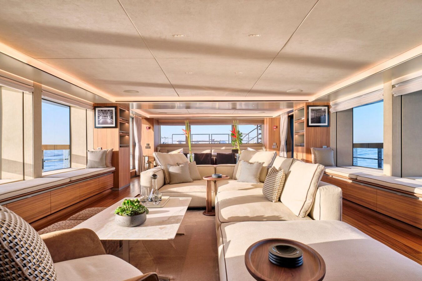 Inside, the yacht reveals a calm, sophisticated atmosphere crafted by Antonio Citterio. Natural materials, soft tones, and panoramic windows define the living spaces, while the full-beam Master suite, elegant guest cabins, and flexible lounges highlight both comfort and versatility. The photo gallery captures a yacht designed for long-range adventure without compromising elegance or lifestyle.