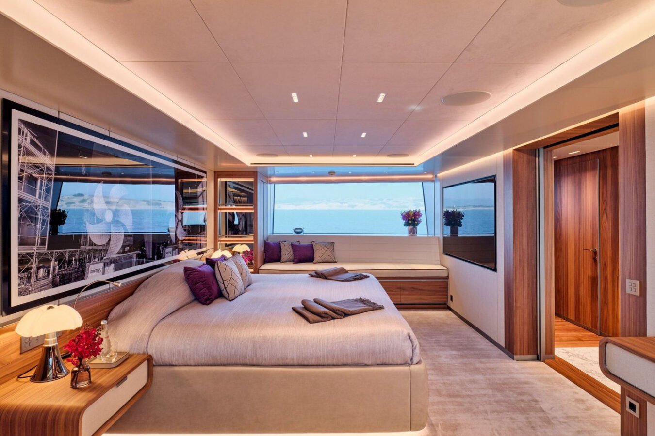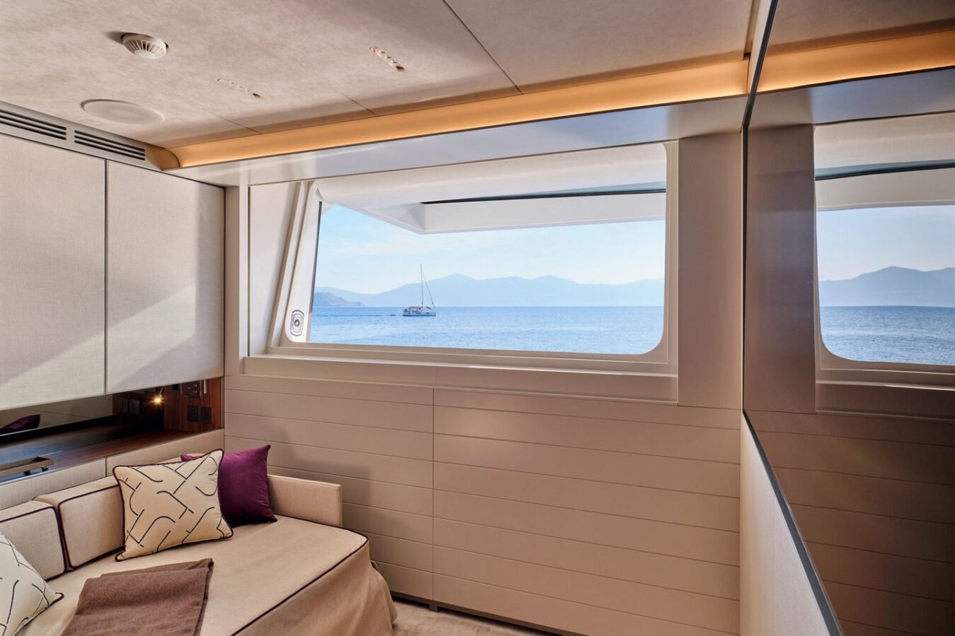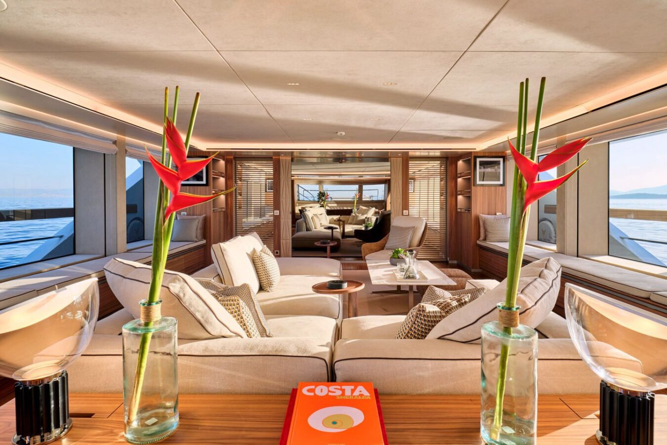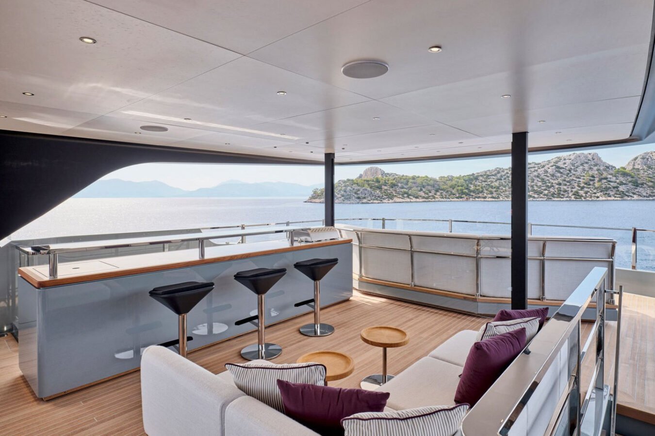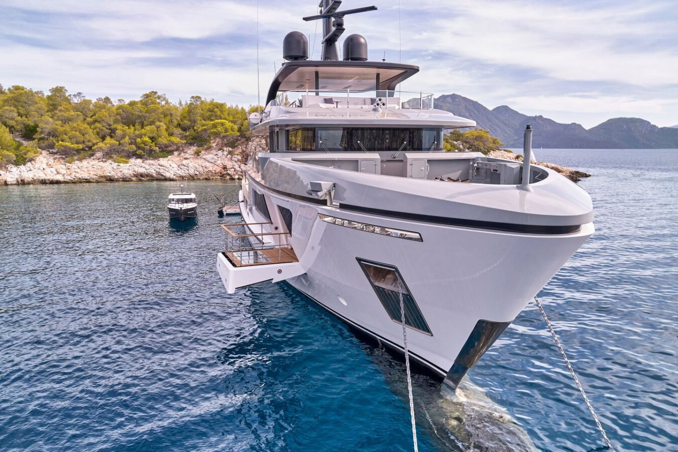 Inside, the yacht reveals a calm, sophisticated atmosphere crafted by Antonio Citterio. Natural materials, soft tones, and panoramic windows define the living spaces, while the full-beam Master suite, elegant guest cabins, and flexible lounges highlight both comfort and versatility. The photo gallery captures a yacht designed for long-range adventure without compromising elegance or lifestyle.