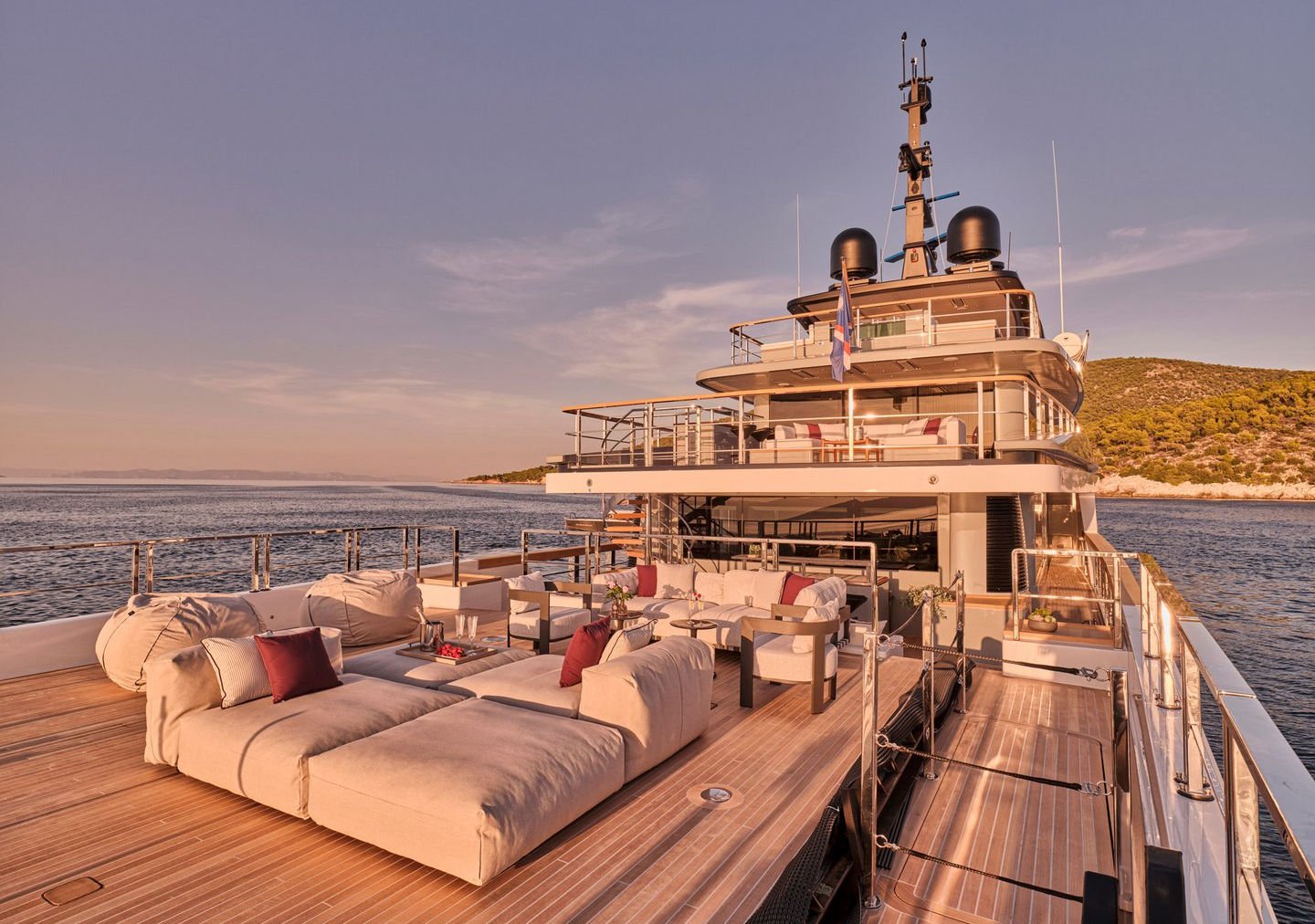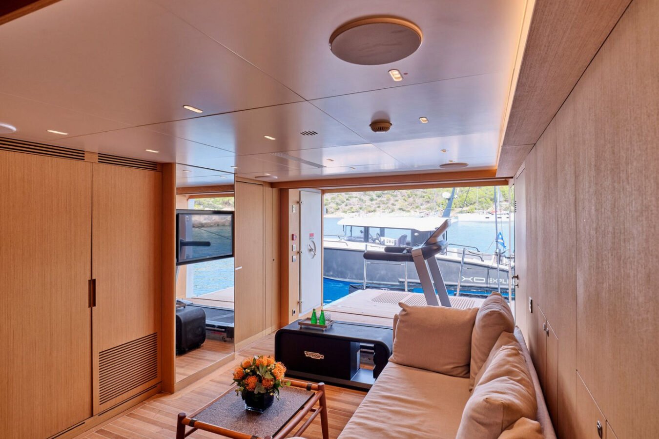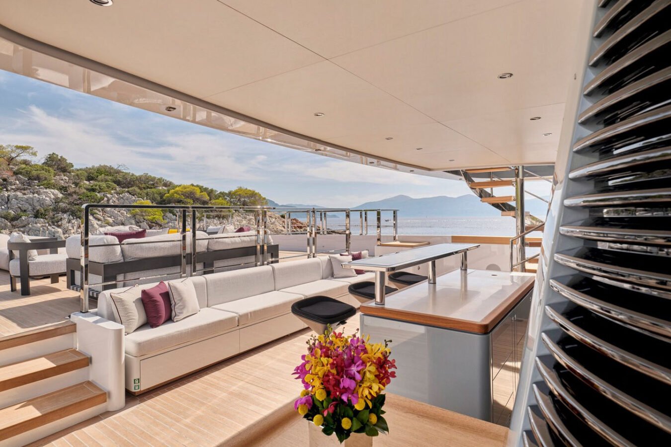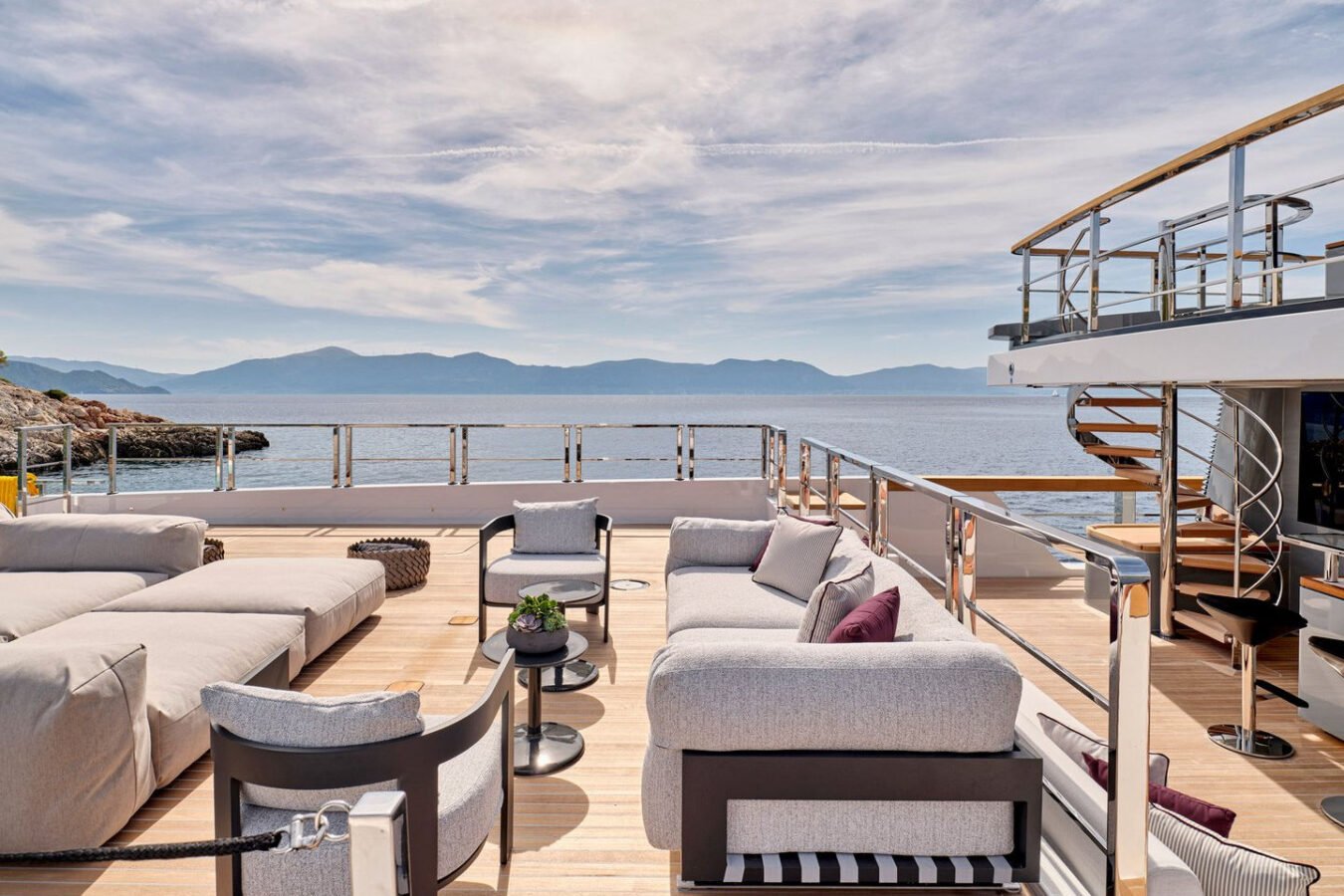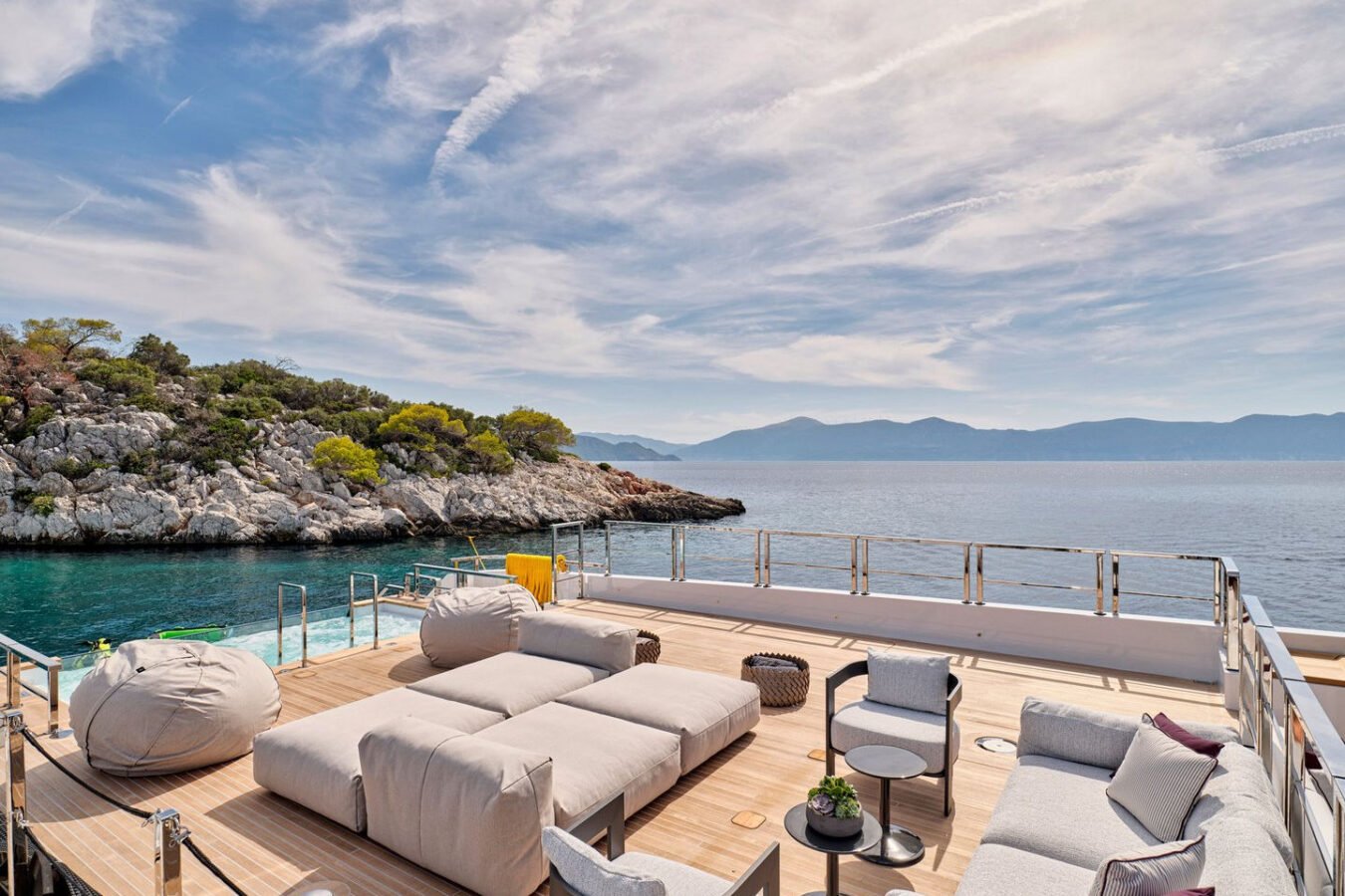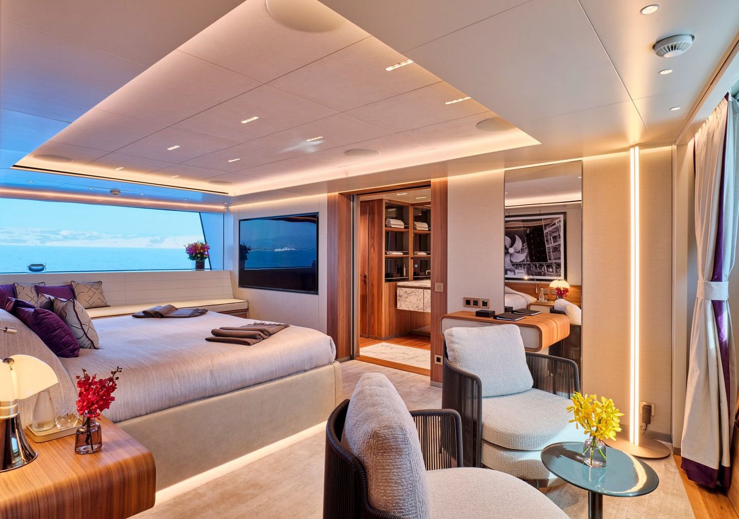 Inside, the yacht reveals a calm, sophisticated atmosphere crafted by Antonio Citterio. Natural materials, soft tones, and panoramic windows define the living spaces, while the full-beam Master suite, elegant guest cabins, and flexible lounges highlight both comfort and versatility. The photo gallery captures a yacht designed for long-range adventure without compromising elegance or lifestyle.