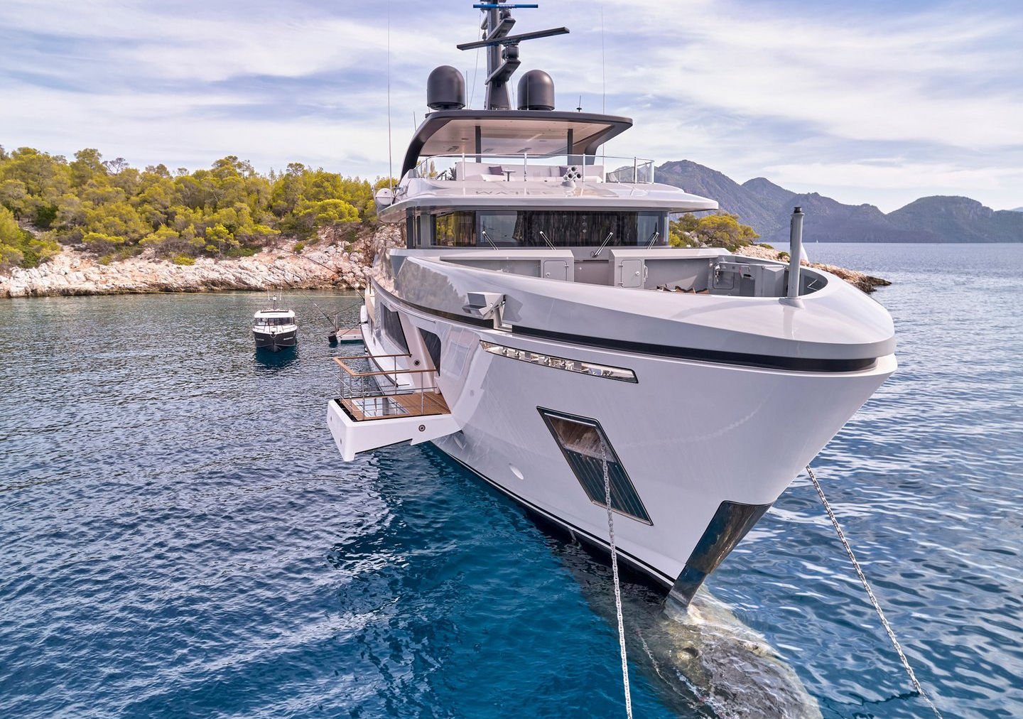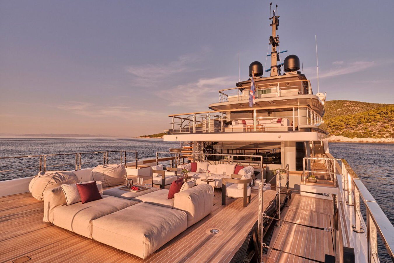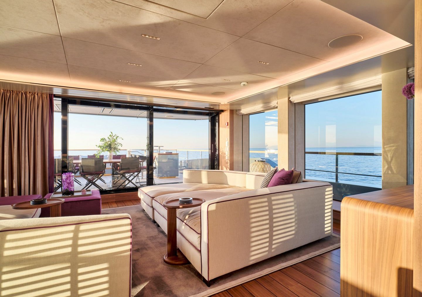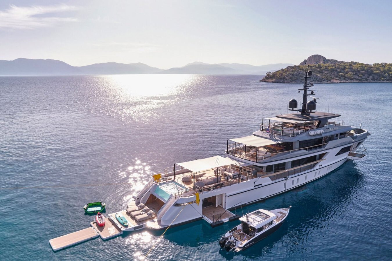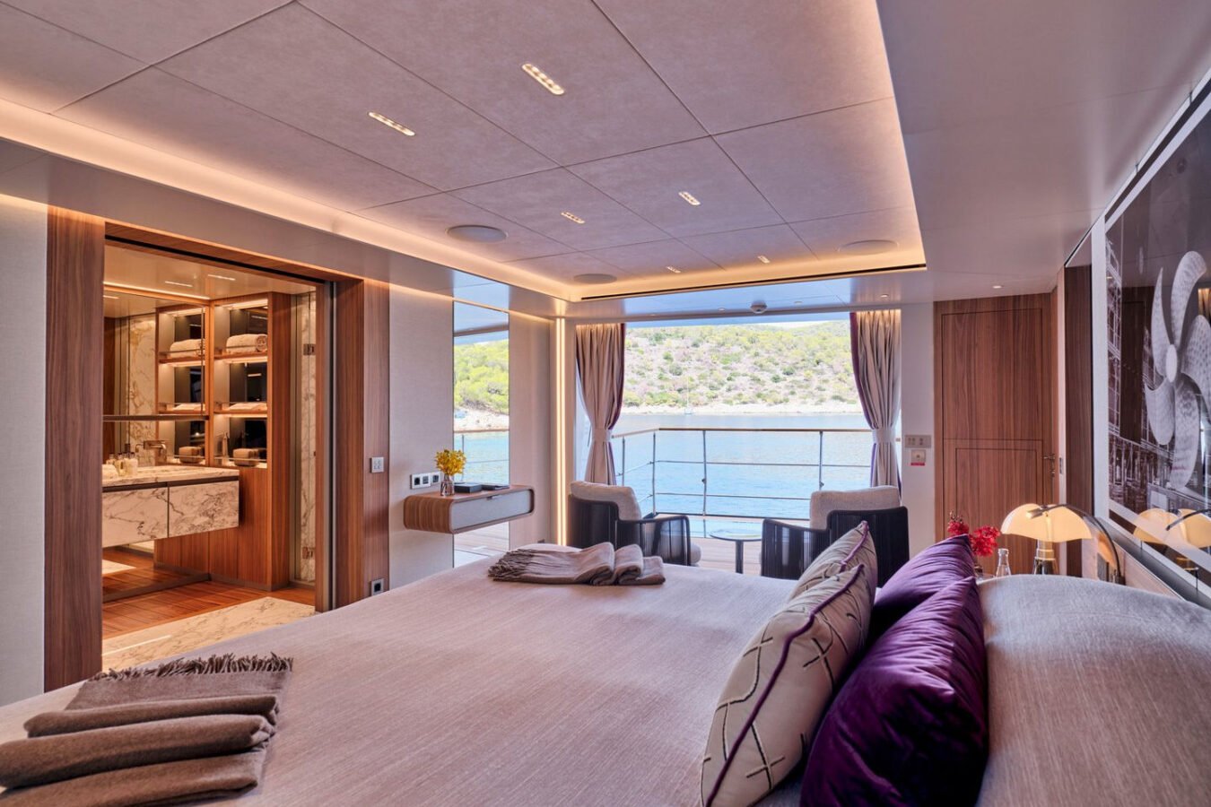 Inside, the yacht reveals a calm, sophisticated atmosphere crafted by Antonio Citterio. Natural materials, soft tones, and panoramic windows define the living spaces, while the full-beam Master suite, elegant guest cabins, and flexible lounges highlight both comfort and versatility. The photo gallery captures a yacht designed for long-range adventure without compromising elegance or lifestyle.