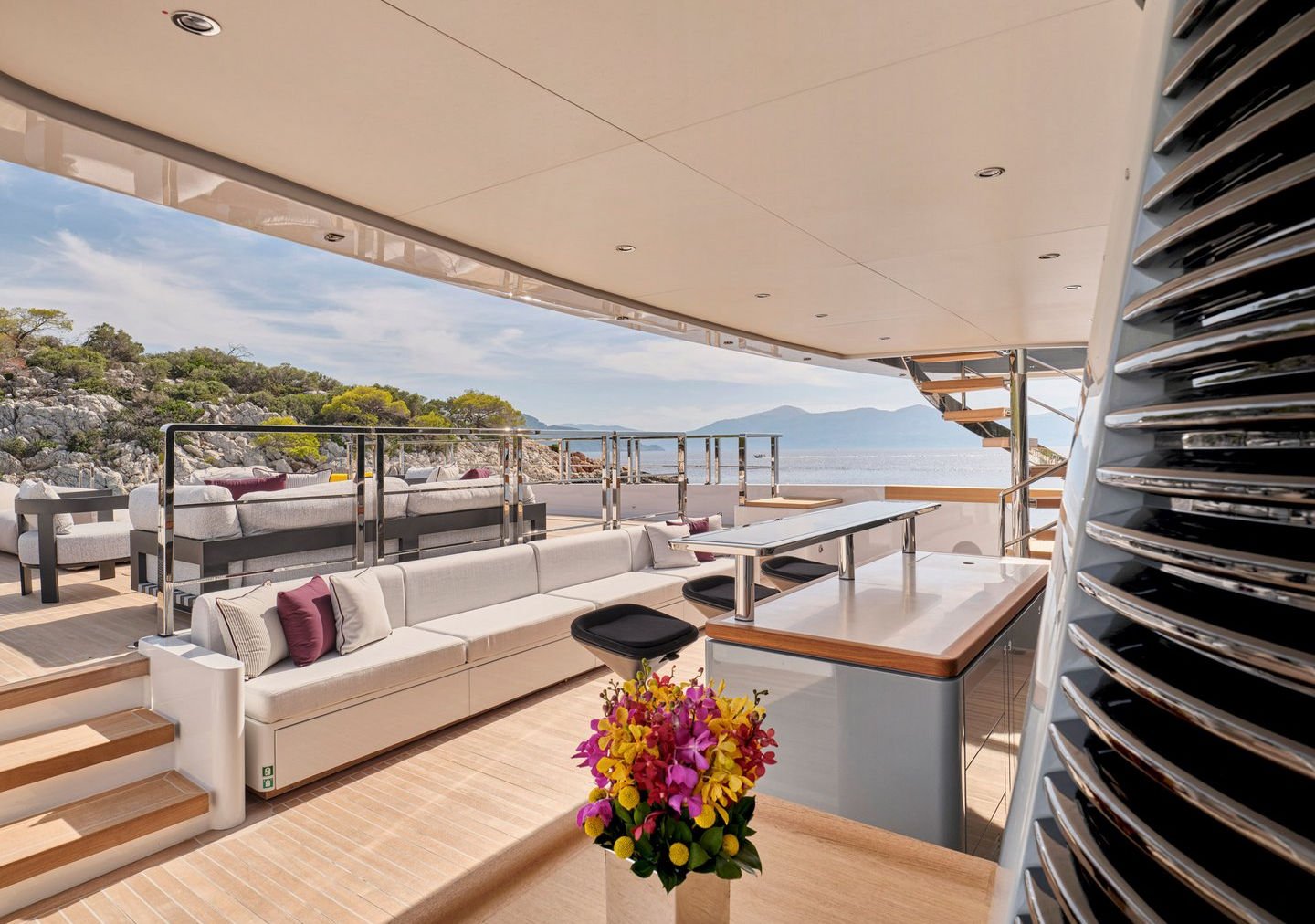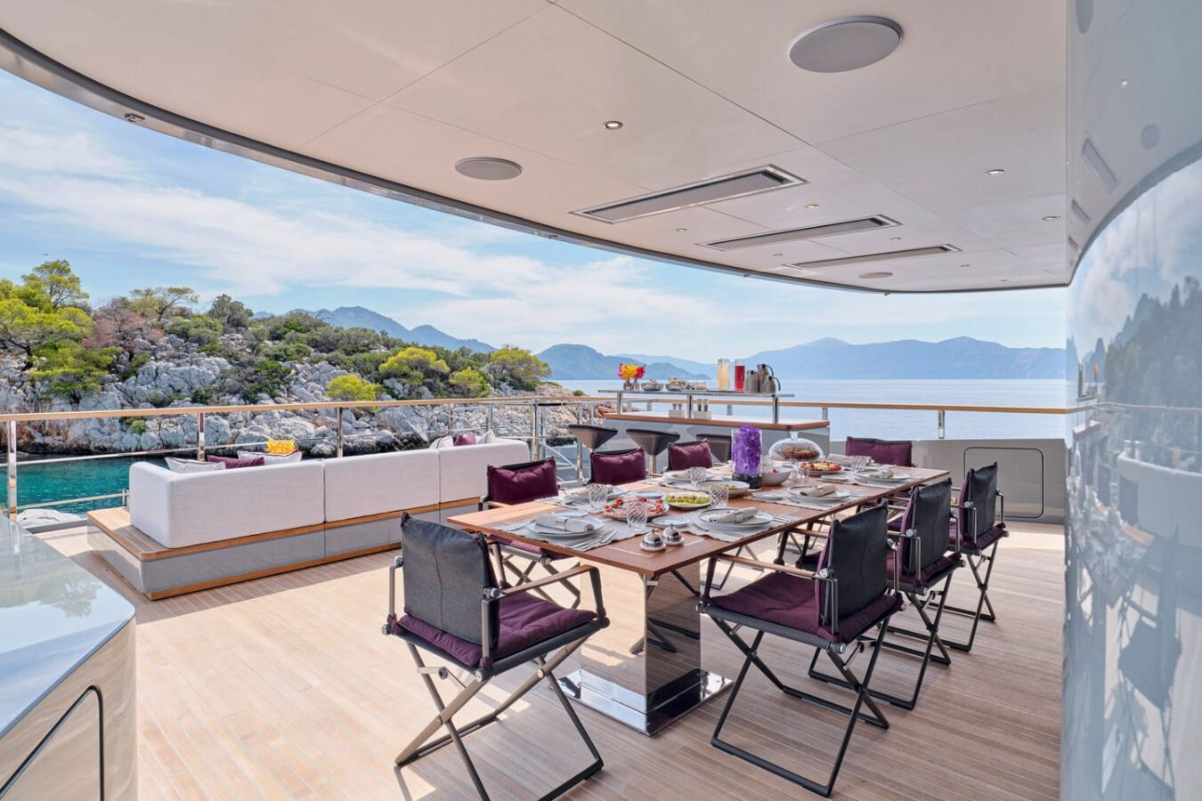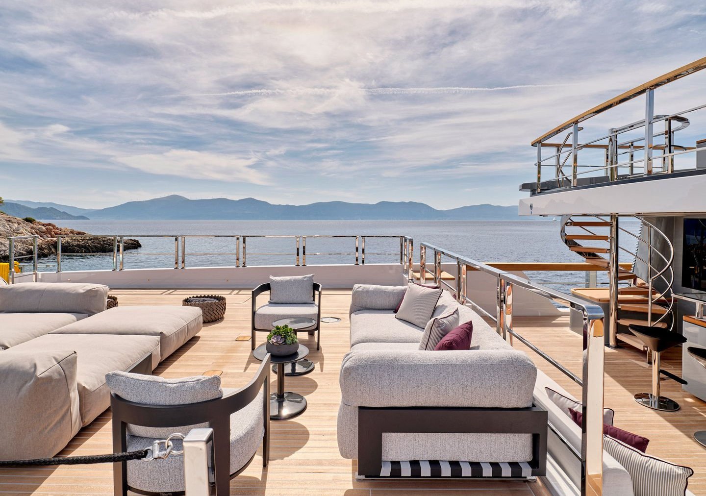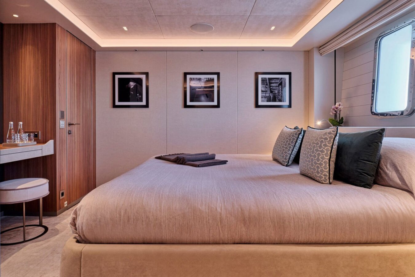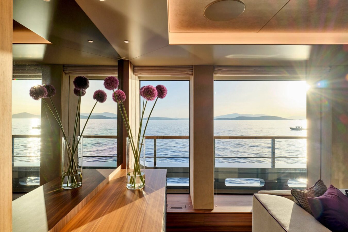 Inside, the yacht reveals a calm, sophisticated atmosphere crafted by Antonio Citterio. Natural materials, soft tones, and panoramic windows define the living spaces, while the full-beam Master suite, elegant guest cabins, and flexible lounges highlight both comfort and versatility. The photo gallery captures a yacht designed for long-range adventure without compromising elegance or lifestyle.