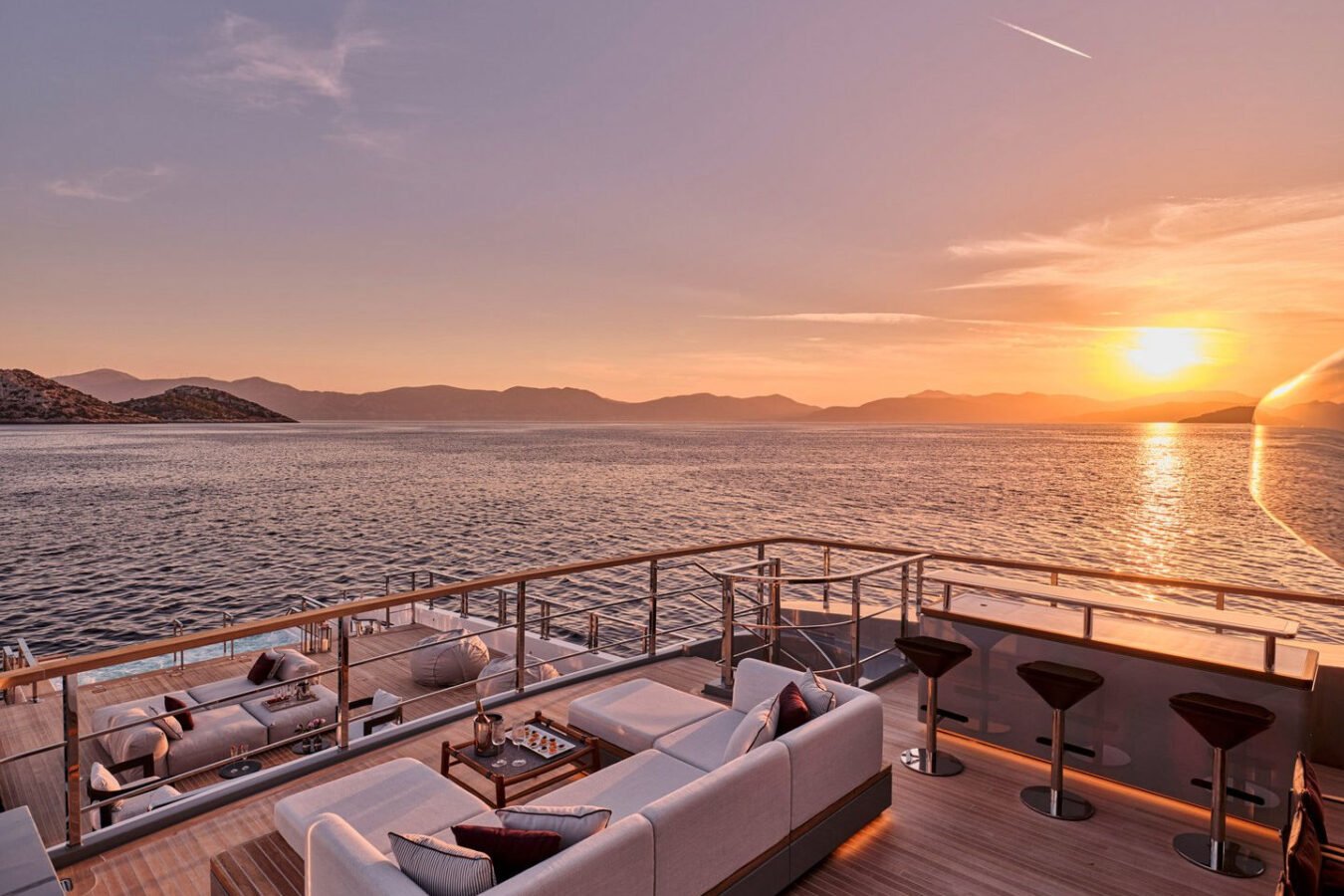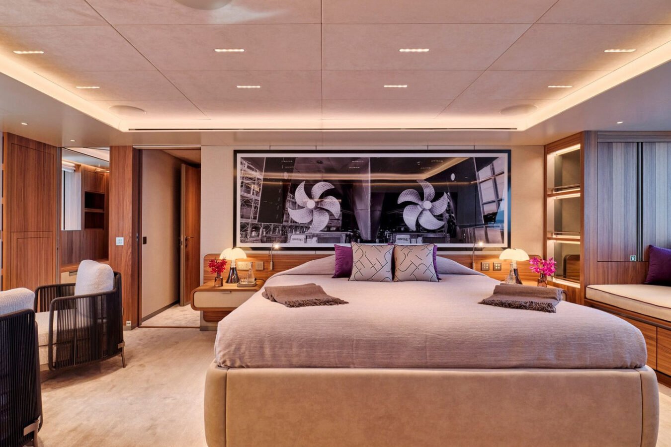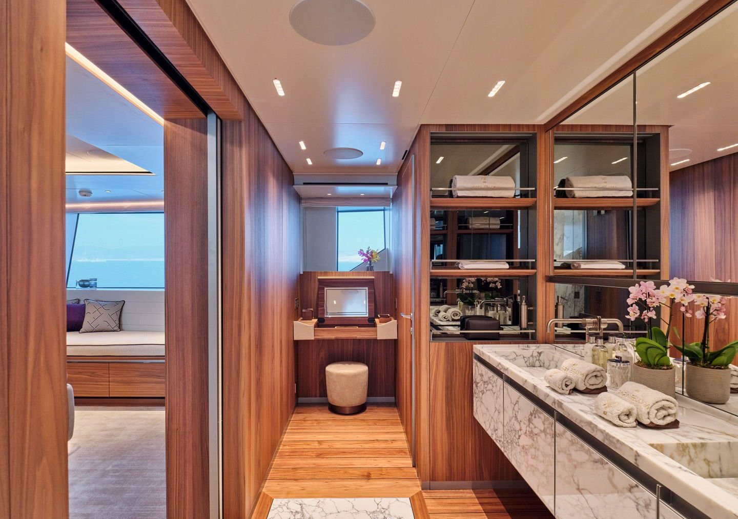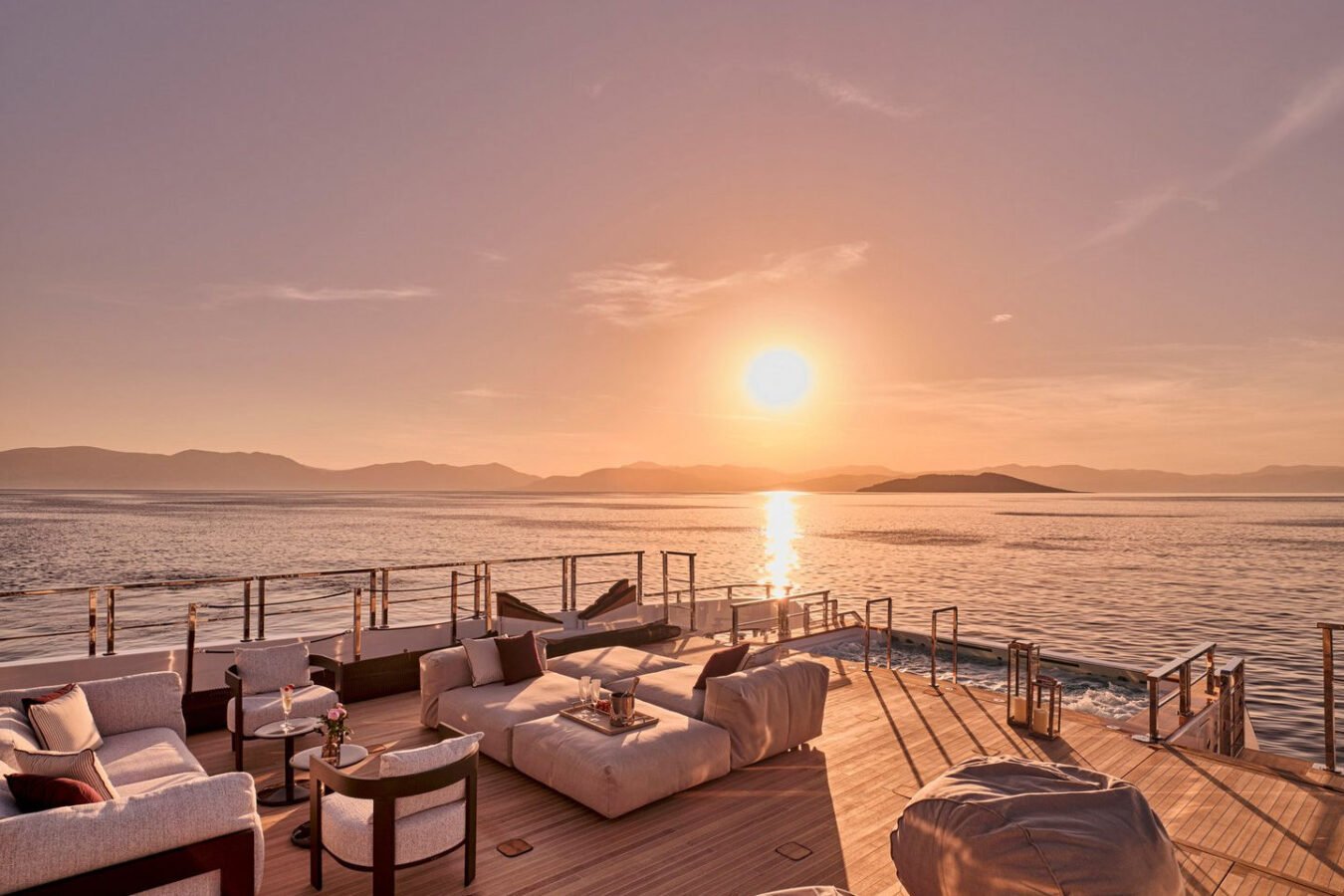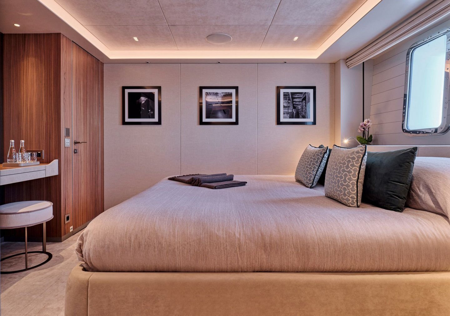 Inside, the yacht reveals a calm, sophisticated atmosphere crafted by Antonio Citterio. Natural materials, soft tones, and panoramic windows define the living spaces, while the full-beam Master suite, elegant guest cabins, and flexible lounges highlight both comfort and versatility. The photo gallery captures a yacht designed for long-range adventure without compromising elegance or lifestyle.