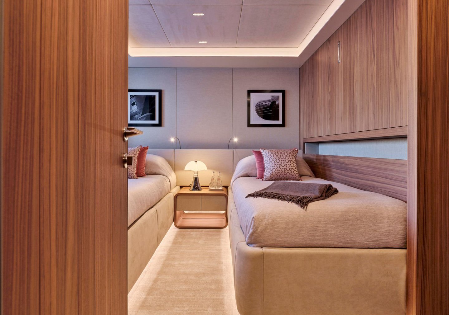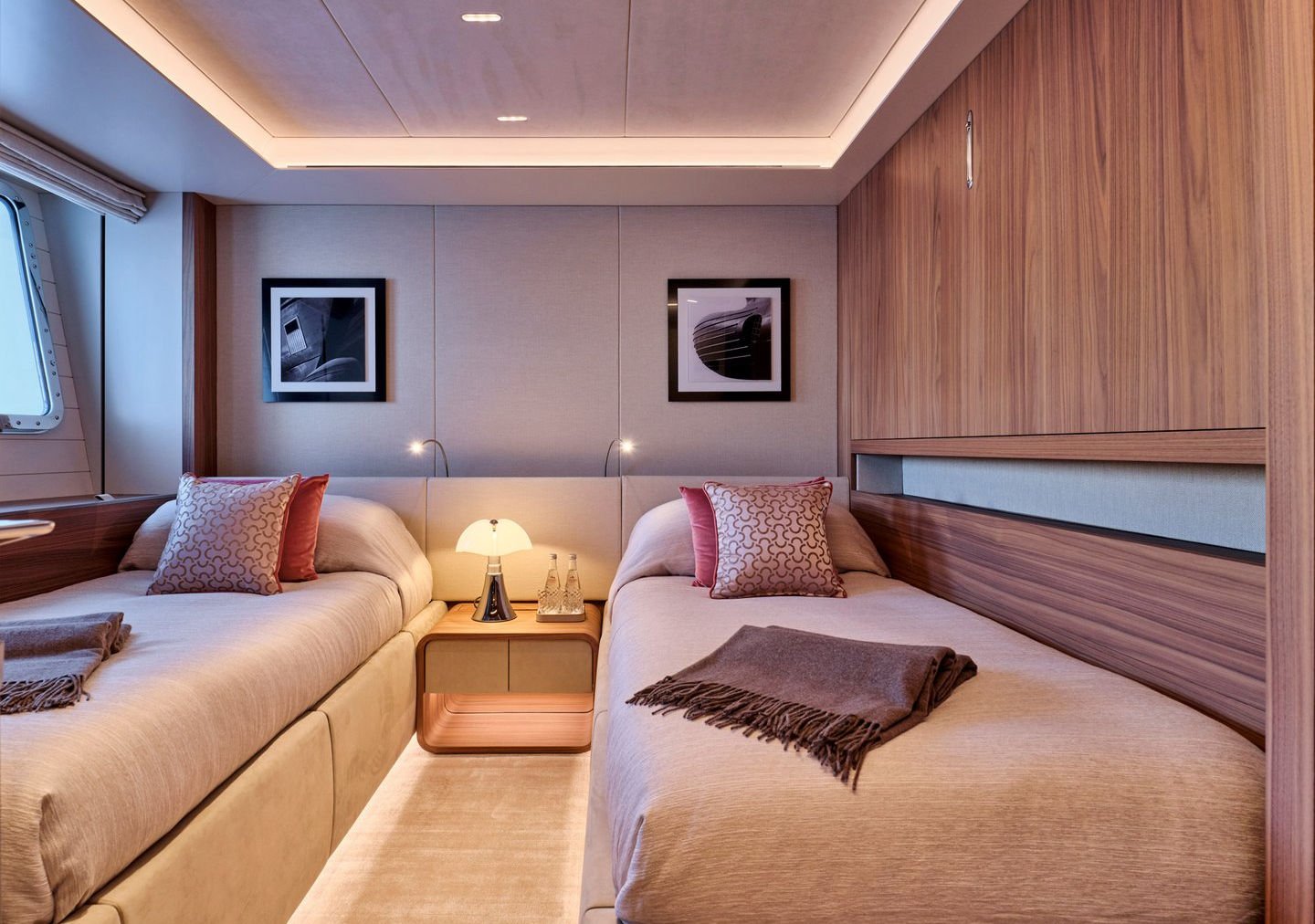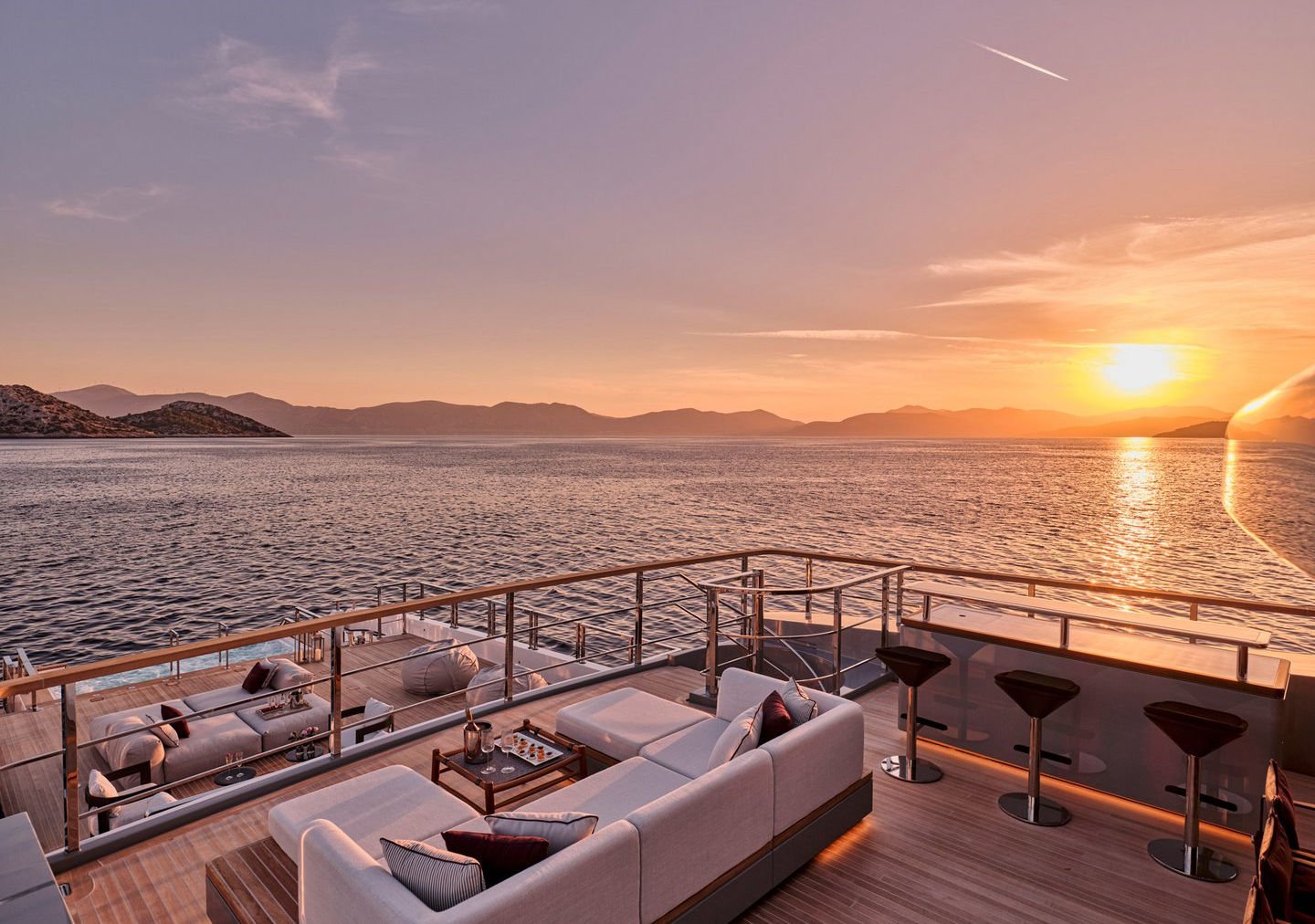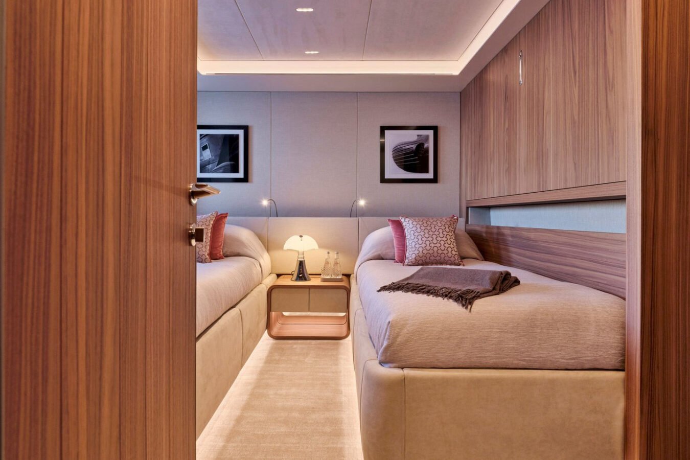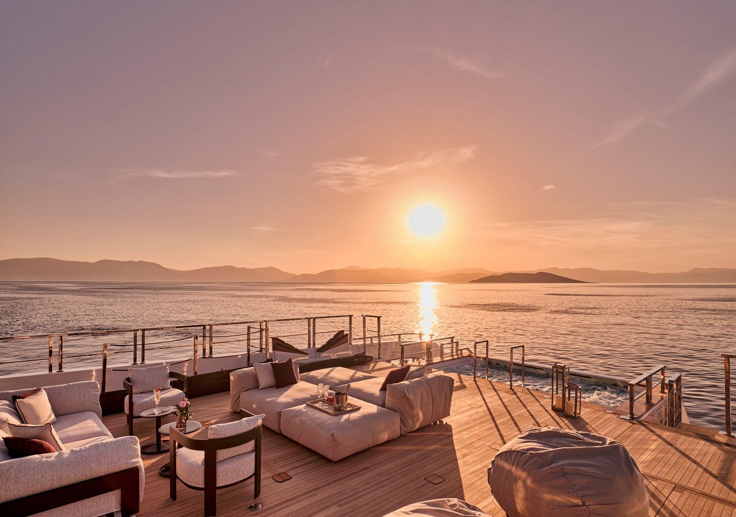 Inside, the yacht reveals a calm, sophisticated atmosphere crafted by Antonio Citterio. Natural materials, soft tones, and panoramic windows define the living spaces, while the full-beam Master suite, elegant guest cabins, and flexible lounges highlight both comfort and versatility. The photo gallery captures a yacht designed for long-range adventure without compromising elegance or lifestyle.