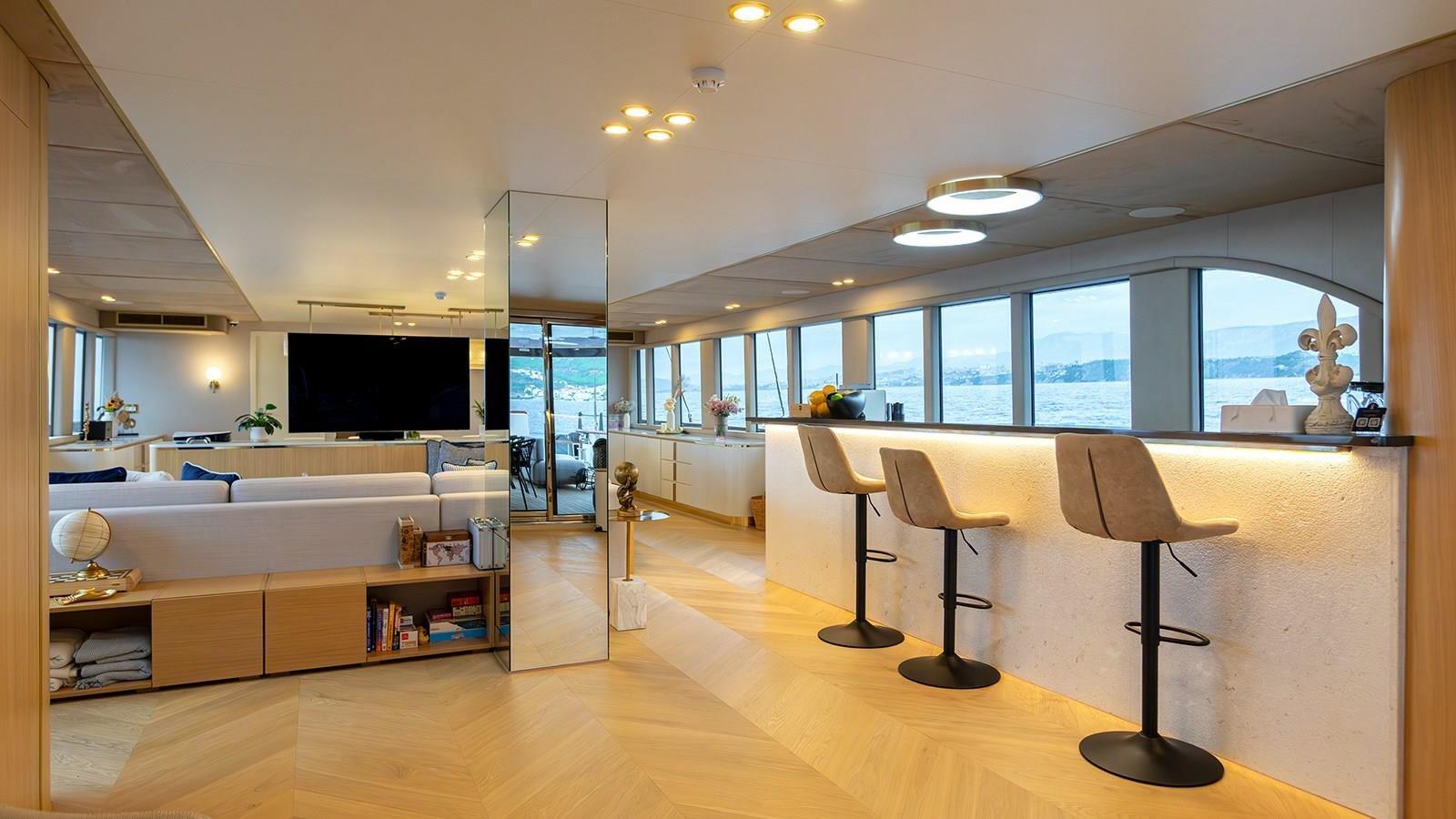 Step aboard and discover a sanctuary of soft tones, natural textures, and light-filled spaces. The main salon welcomes guests with herringbone woodblock flooring and expansive windows that flood the interior with natural light. Muted color palettes, plush furnishings, and intelligent layout choices create an ambiance of refined relaxation and understated luxury.