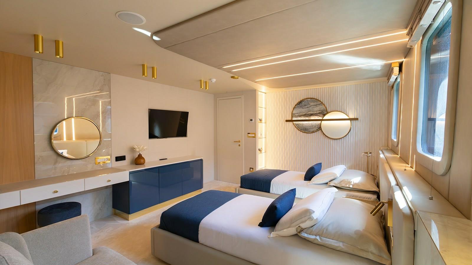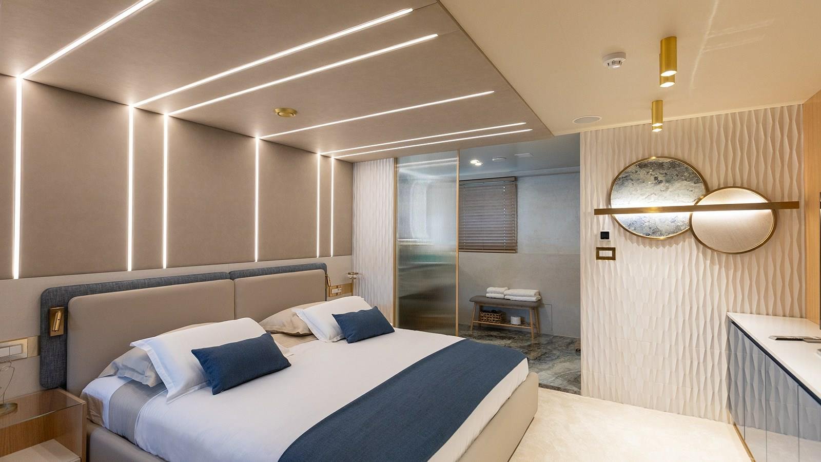 Each of the six guest cabins on Scorpios is a tranquil haven, thoughtfully designed with premium materials and subtle elegance. Spacious layouts, refined décor, and en-suite facilities ensure maximum comfort and privacy. Whether it’s the master suite or one of the guest cabins, each space is a reflection of refined taste and meticulous attention to detail. The result is a sleep experience that rivals the best five-star boutique hotels.